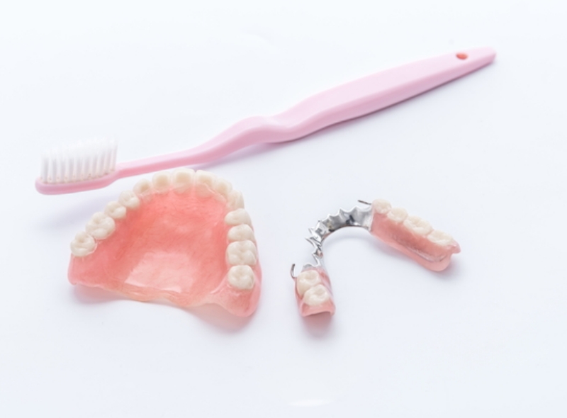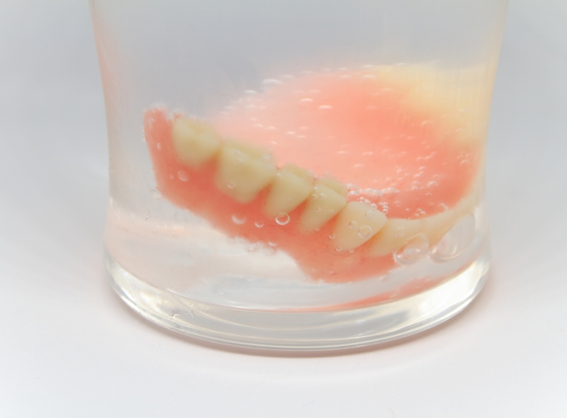多くの入れ歯はレジン製の硬質プラスチックで作られているため、高温にさらされると変形するおそれがあります。そのため洗う際は、水もしくはぬるま湯を用いて、入れ歯専用ブラシで表面をやさしく磨きましょう。ブラシでは落としきれない汚れは、洗浄剤(ポリデントなど)を併用すれば、除去しやすくなります。