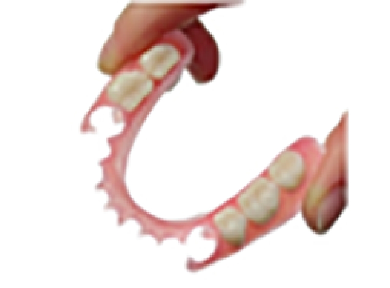 ノンクラスプデンチャー は、金属のバネで支えるのではなく、歯肉と同じ色の樹脂で支える義歯です。樹脂が柔らかくて軽いので装着時の違和感が少なく、外からバネが見えないため、見た目も目立ちにくいのが特徴です。さらには、歯の根元で支えるので、歯への負荷も少なくて済みます。